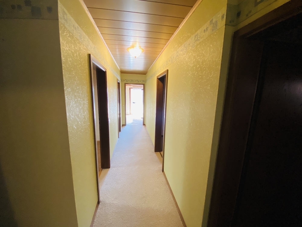 Mit etwas Renovierungsaufwand lässt sich dieses geräumige Einfamilienhaus in ruhiger Ortsrandlage in ein tolles Domizil für die Großfamilie verwandeln. Durch den überdachten Eingangsbereich gelangen Sie in die großzügige Diele mit Gäste-WC und weiter über den zentralen Flur in die Küche, den offenen Wohn-Essbereich, das Kinderzimmer, das Schlafzimmer und einen kleinen Abstellraum. Vom Ess- und Schlafzimmer haben Sie Zugang zum Wintergarten und weiter in den Garten. Das Obergeschoß mit seinen fünf Zimmern und einem Duschbad, bietet viele Gestaltungsmöglichkeiten. Die Zimmer können sowohl als Kinder- und Spielzimmer, sowie als Büroräume genutzt werden. Der Keller mit einem Partyraum, einer kleinen Bar, einem Vorratsraum und einem Abstellraum bieten weitere tolle Nutzungsmöglichkeiten. Die Doppelgarage mit davorliegenden Stellplätzen rundet dieses Angebot ab. **Haben wir Ihr Interesse geweckt?** Schreiben Sie uns gerne eine Anfrage. Im Anschluss erhalten Sie von uns einen Download-Link zum Laden des Exposees mit weiteren Informationen. Nach dem erfolgreichen Download vereinbaren wir gerne mit Ihnen einen Besichtigungstermin.Lage