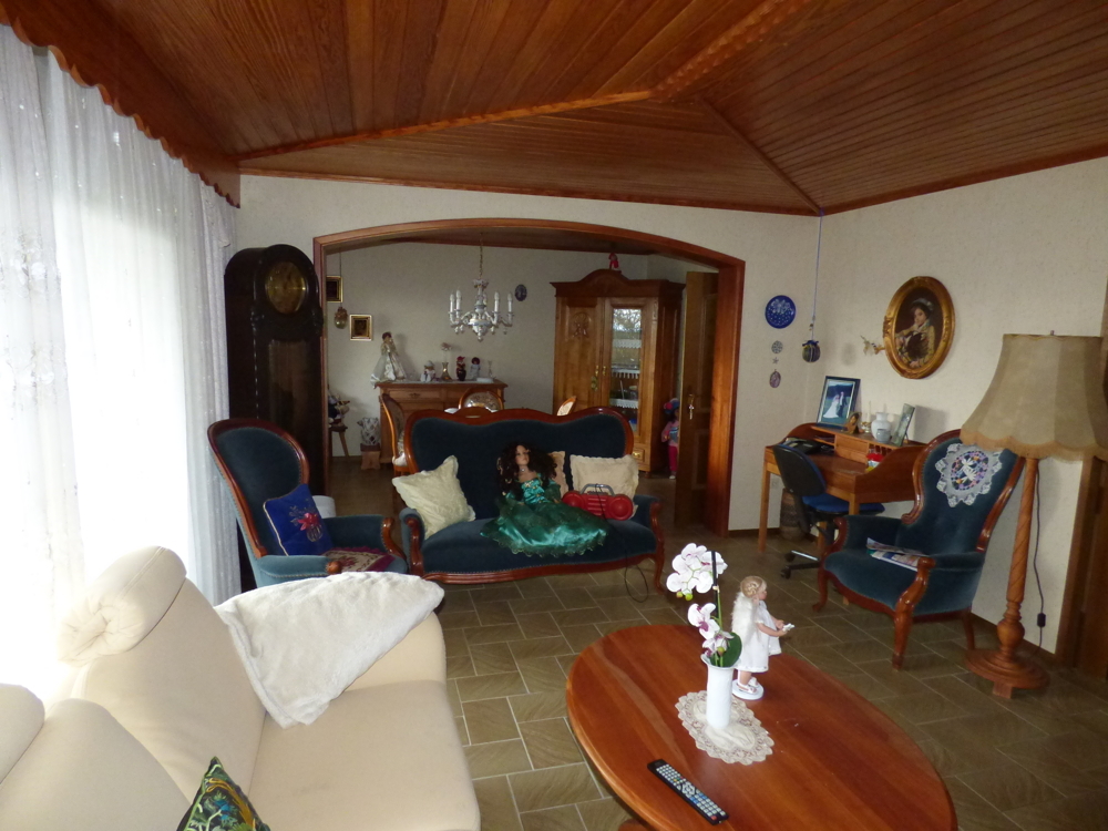 Hier kommt ein ganz besonderes Einfamilienhaus mit Einliegerwohnung und riesigem Grundstück zum Verkauf! Dieses charmante Haus bietet Platz für die ganze Familie, beeindruckt durch großzügige Räumlichkeiten, eine hochwertige Ausstattung und ein Grundstück, das Naturfreunde und Hobbygärtner gleichermaßen begeistern wird.Das Haus liegt in einer idyllischen Lage mit herrlichem Blick auf die Umgebung. Hauptwohnung im Erdgeschoss Beim Betreten der Hauptwohnung werden Sie von einem großzügigen Flur empfangen, der viel Platz für Garderobe und Schuhe bietet. Ein stilvolles Gäste-WC mit künstlerisch gestaltetem Fenster sorgt für einen einladenden ersten Eindruck. Zur linken Seite gelangen Sie in den Essbereich, der direkt an die funktionale Küche angrenzt. Das Herzstück der Wohnung ist das riesige Wohnzimmer, das durch seine großen Fensterflächen lichtdurchflutet ist. Über zwei große Schiebetüren haben Sie Zugang zu einem Balkon, von dem aus Sie einen atemberaubenden Blick auf das weitläufige Grundstück mit seinen Obstbäumen genießen können. Das Hauptbad bietet mit einer Badewanne und einer Dusche genügend Komfort. Die beiden Schlafzimmer, die durch ein kleines Ankleidezimmer verbunden sind, bieten reichlich Platz und Rückzugsmöglichkeiten. Das große Schlafzimmer verfügt ebenfalls über einen Zugang zum Balkon. Keller und Technik Vom Flur führt eine Treppe in das Untergeschoss, das praktischen Stauraum in einem Vorratsraum sowie einen Heiz- und Waschraum bietet. Garage und Werkstatt Eine Doppelgarage ist direkt an das Haus angebaut. Diese ist unterkellert und beherbergt eine Werkstatt, die auch als zusätzliche Garage genutzt werden kann. Einliegerwohnung im Untergeschoss Die Einliegerwohnung mit separatem Zugang bietet auf ca. 77 m² Wohnfläche drei Zimmer, eine Küche und ein Bad. Vor der Wohnung befindet sich eine große Terrasse. Das Grundstück Mit seiner Weitläufigkeit, den Obstbäumen und dem Garten bietet es unzählige Möglichkeiten.Lage